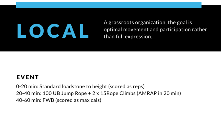 Lokális (Local): alulról szerveződő szint, ahol is a cél az optimális mozgásminőség és a részvétel önmagában, mintsem a potenciális képességek teljes mérvű kisajtolása.