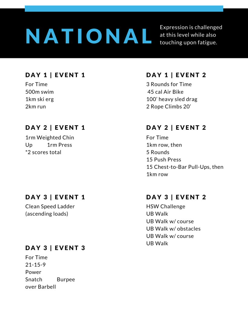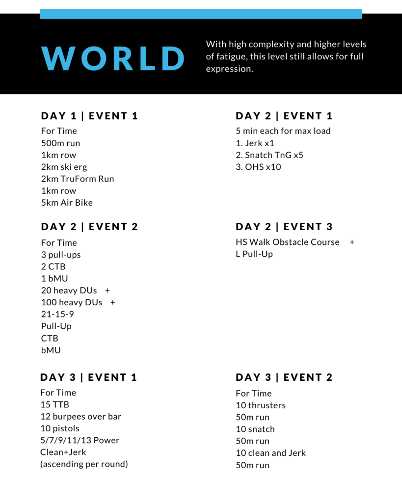 A tesztek variációi kategóriánként Az alapfelállás, hogy a kihirdetett Elit és Open WOD-ok azonosak minden korosztály számára, azokban csak a súlyok, illetve egyes gyakorlatok részei térnek el. Ezen súly és gyakorlat változatokat az alábbi felsorolásban korosztályonként és divízókra bontva olvashatjátok. Azokat a feladatokat, amelyeket mindenki számára egységesnek határoztunk meg, külön kiemeljük a felsorolás elején.