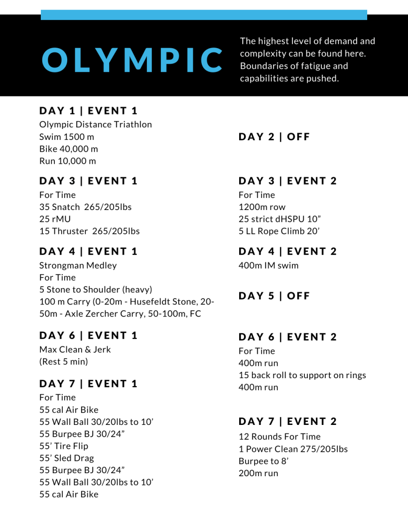 Olimpiai(Olympic): értelemszerűen ezen a legmagasabb szinten találkozhatunk a legkomolyabb kihívásokkal és feladat komplexitásokkal. A fáradtság és a képességek határai maximálisan feszegetve vannak!